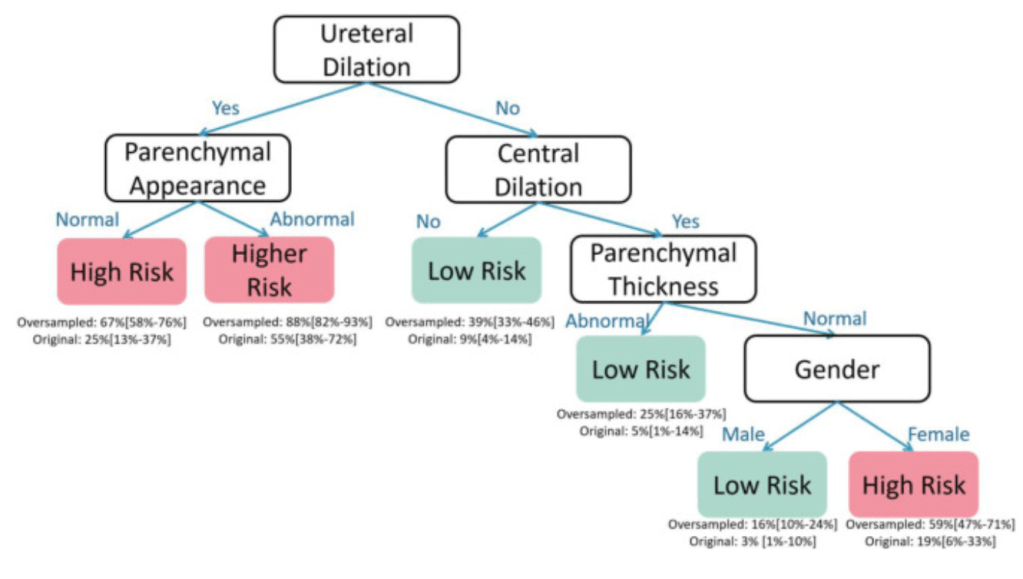 | Model Input | Patient demographics (age at US, sex, kidney laterality) and UTD features (primary antero-posterior diameter, central calyceal dilation, peripheral calyceal dilation, parenchymal thickness, parenchymal appearance, distal ureteral dilation) |